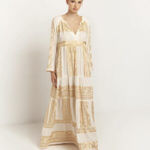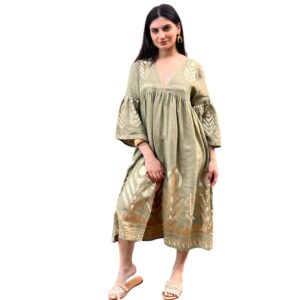 Χακι λινό μακρύ φόρεμα με χρυσό Feather κέντημα GREEK ARCHAIC KORI