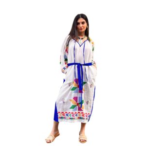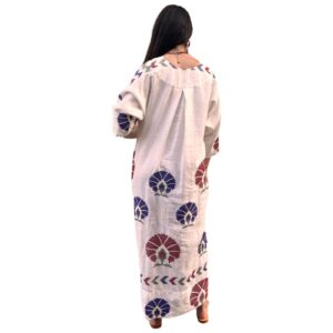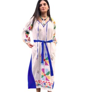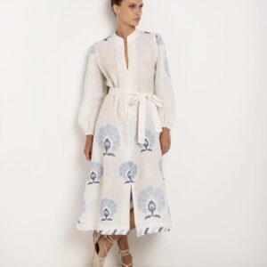 Greek Archaic Kori Linen Peacock Maxi Embroidered Dress White