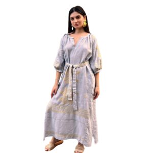 Greek Archaic Kori Aeolis Maxi Linen Embroidered Dress light gray/gold
