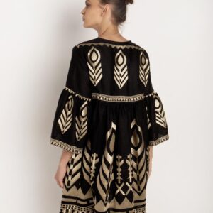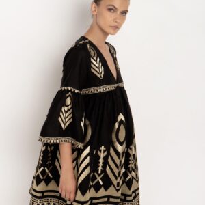 Greek Archaic Kori Embroidered Linen Mini Feather Dress Black/Gold
