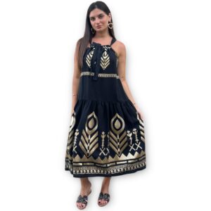 Feather μαύρο/χρυσό μακρύ λινό φόρεμα Greek Archaic Kori