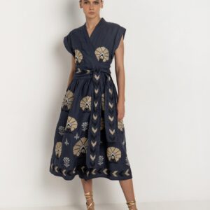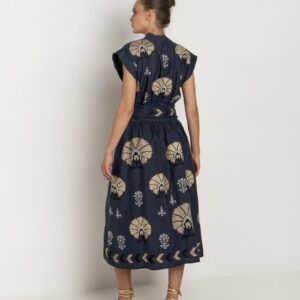 Greek Archaic Kori Linen Peacock Mixi Embroidered Dress Navy Blue/ Gold