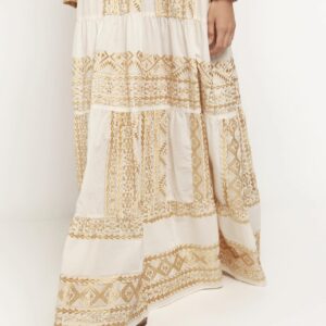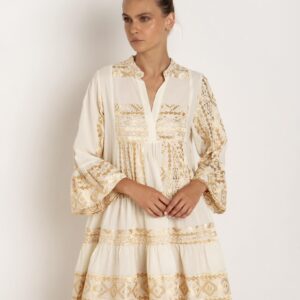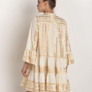 Greek Archaic Kori Embroidered Cotton Boho Mini Dress White/Gold