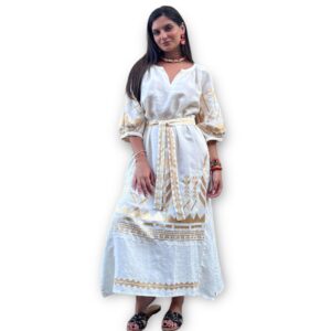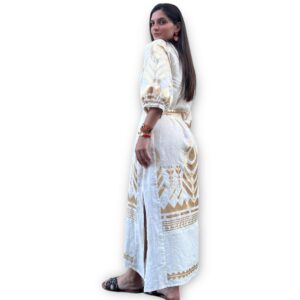 Greek Archaic Kori Linen Maxi Feather Belt Dress White /Gold