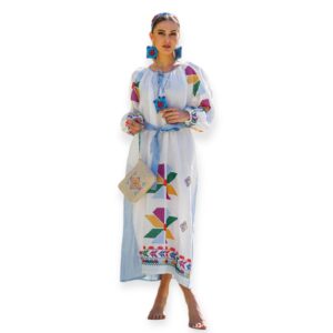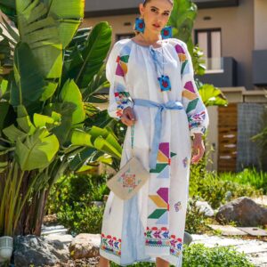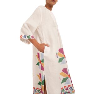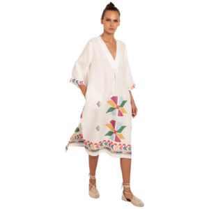 Λευκό λινό φόρεμα με χρυσό Feather κέντημα και V λαιμόκοψη