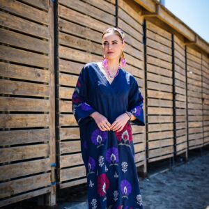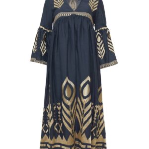 Μπλε λινό μακρύ φόρεμα με χρυσό Feather κέντημα GREEK ARCHAIC KORI