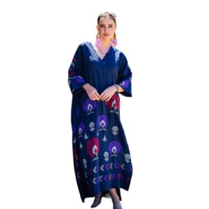 Greek Archaic Kori Linen Peacock Maxi Embroidered Dress