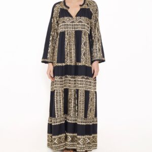 Μαύρο βαμβακερό μακρυμάνικο φόρεμα με χρυσό κέντημα Greek Archaic Kori