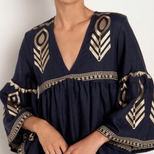 Navy Blue-Gold μίνι λινό Φόρεμα AEOLIS Greek Archaic Kori