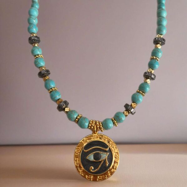 Χειροποίητο κολιέ από ορυκτές χάντρες και μεταλλικό μενταγιόν με σμάλτο