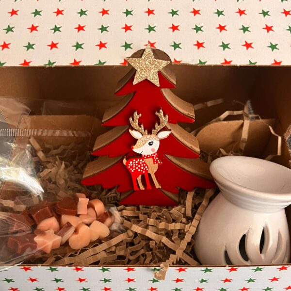 Το σετ περιλαμβάνει λευκό αρωματιστή, 1 κεράκι ρεσό και 15 wax melts χριστουγεννιάτικο ξύλινο επιτραπέζιο δεντράκι σε συσκευασία δώρου . Αυτοκόλλητη κάρτα για ευχές στο πάνω μέρος του κουτιού .