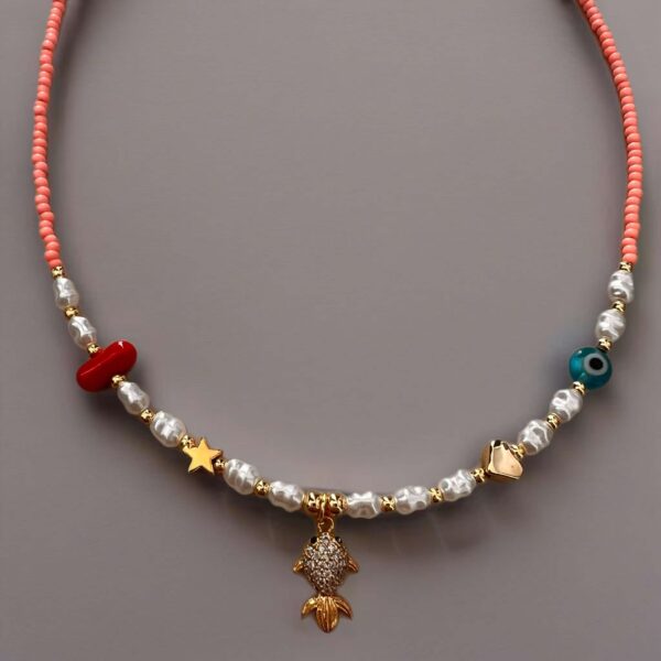 Κολιέ με χάντρες και μεταλλικό ψαράκι με σμάλτο