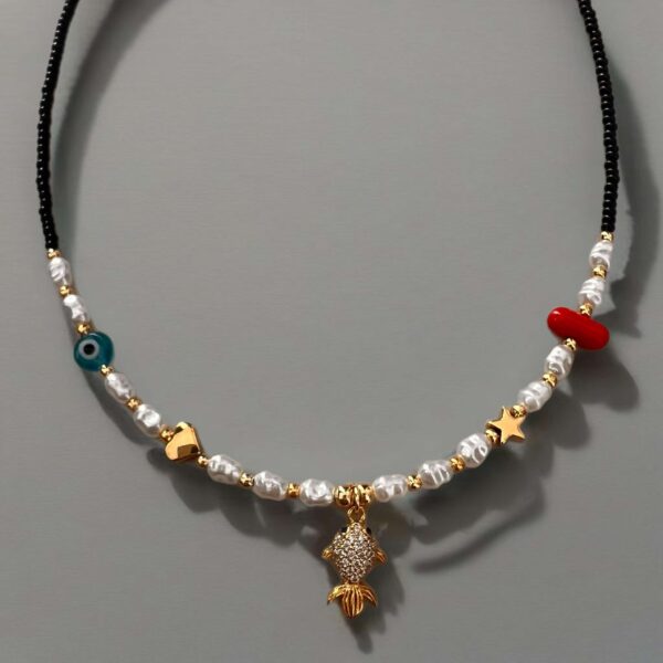 Κολιέ με χάντρες και μεταλλικό ψαράκι με ζιργκόν