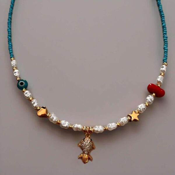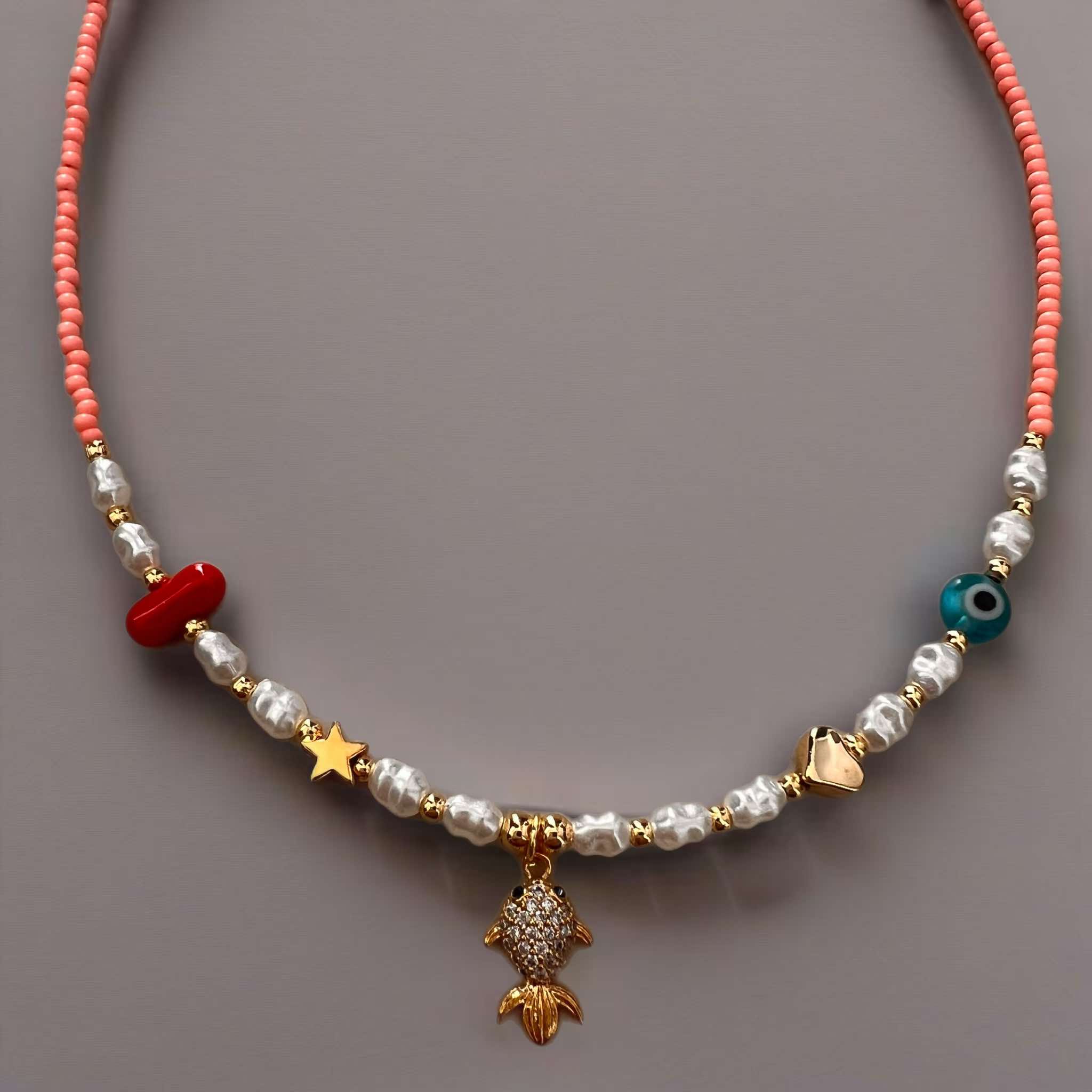 Κολιέ με χάντρες και μεταλλικό ψαράκι με ζιργκόν