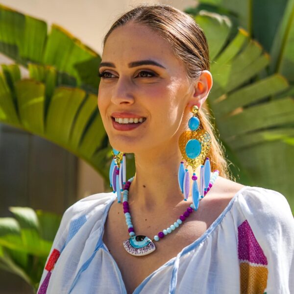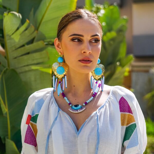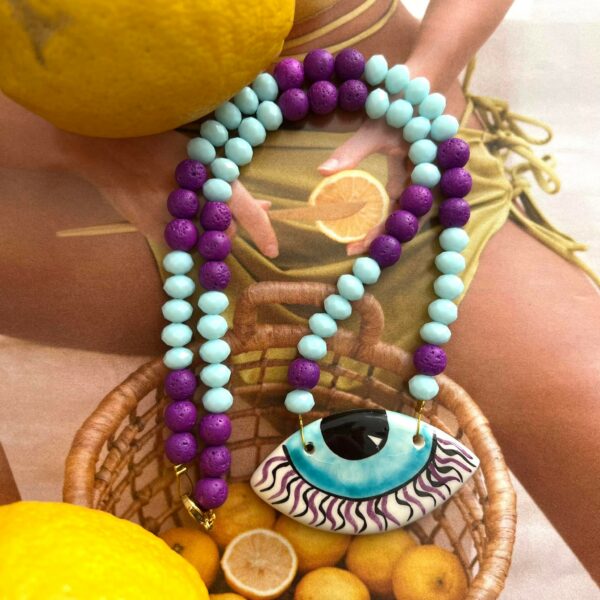 Κολιέ με χειροποίητο κεραμικό μάτι ζωγραφισμένο στο χέρι με λάβα και ακρυλικές χάντρες