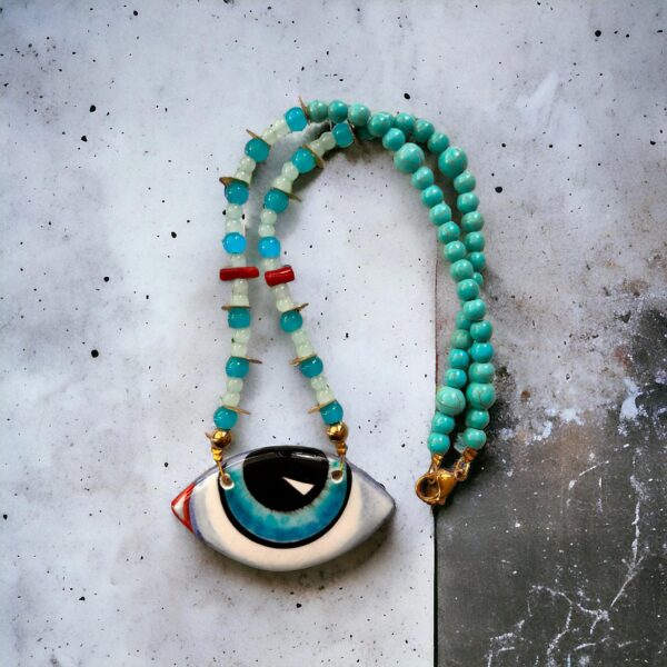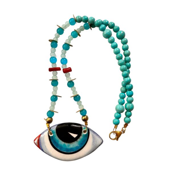 Κολιέ με ζωγραφισμένο κεραμικό μάτι κρύσταλλα,χαολίτη και κοράλλι Light Blue