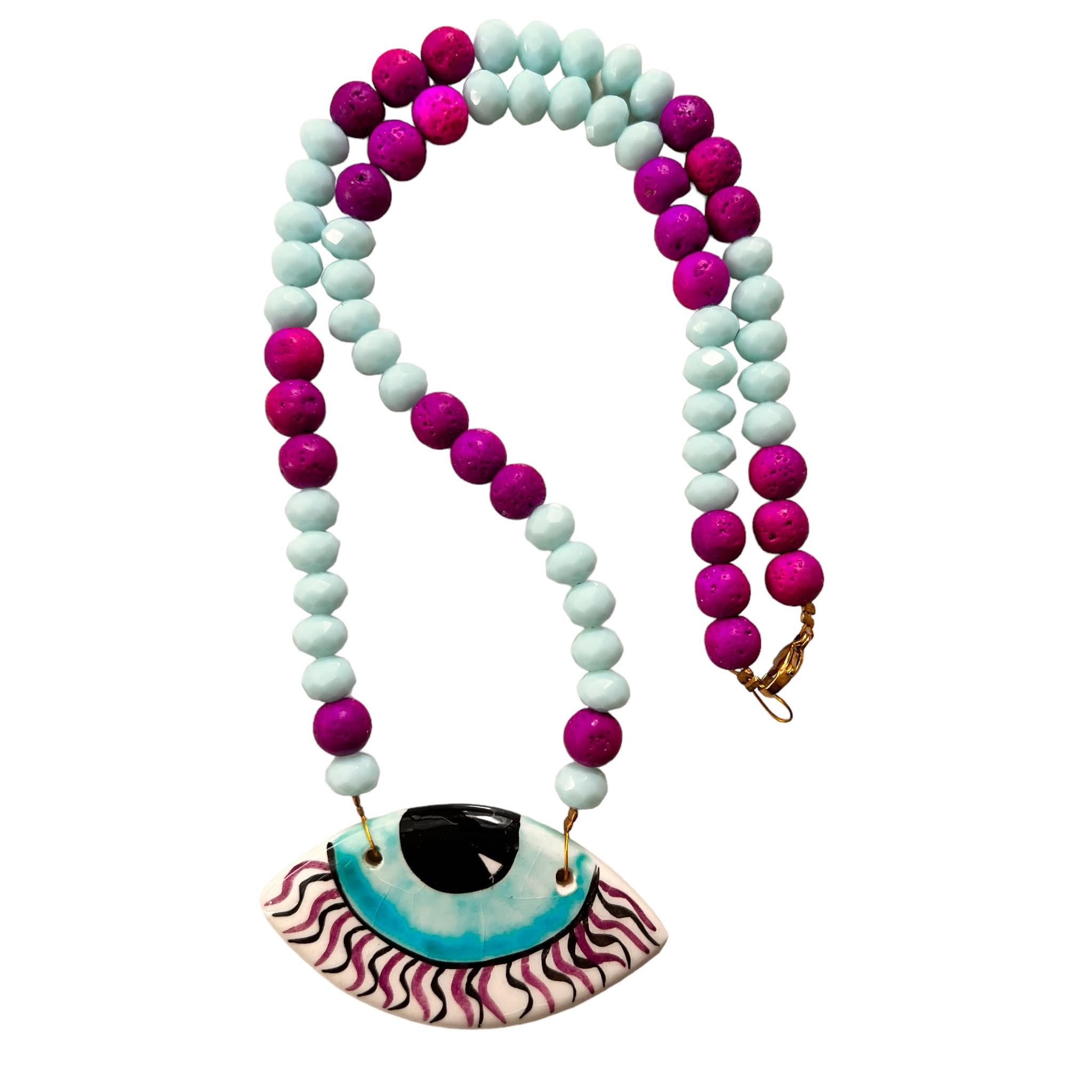 Αυτό το κολιέ συνδυάζει ένα ζωγραφισμένο κεραμικό μάτι με κρύσταλλα, δημιουργώντας έναν εντυπωσιακό συνδυασμό μεταξύ μυστηρίου και λάμψης. Το μάτι αναδεικνύει μια αίσθηση προστασίας και τύχης, ενώ τα κρύσταλλα αίματος προσδίδουν λάμψη και φως. Μια μοναδική κομψή προσθήκη σε κάθε εμφάνιση, αναδεικνύοντας τη μαγευτική ομορφιά με διακριτικό τρόπο.