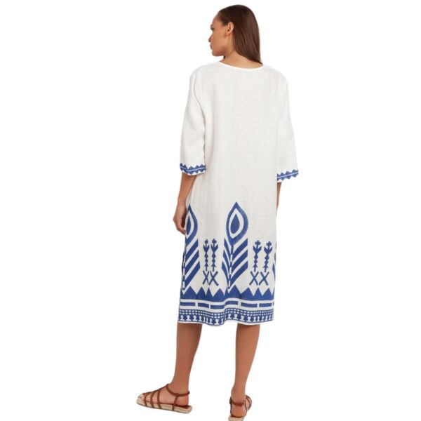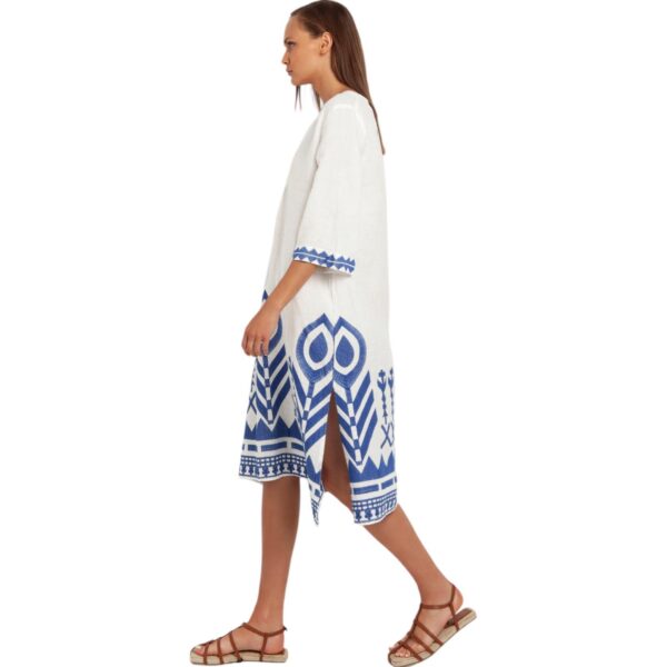 Greek Archaic Kori λινό φόρεμα σε άνετη γραμμή με V λαιμόκοψη, κοντά μανίκια με βολάν και διακοσμημένο με κομψά κεντήματα.
