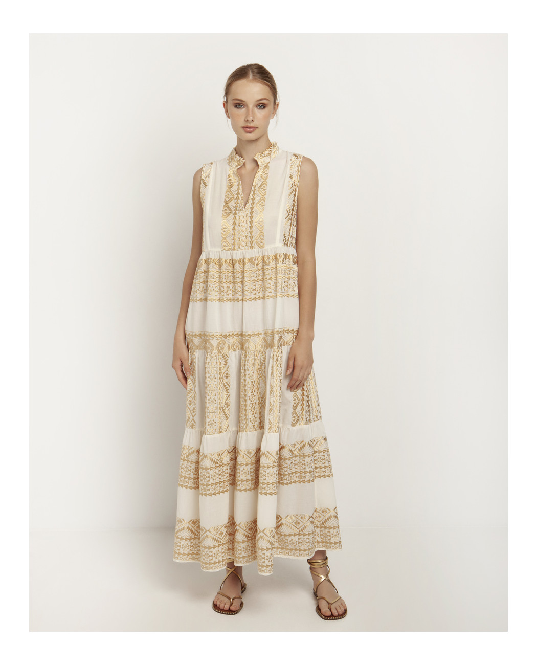 Λευκό λινό φόρεμα με χρυσό Feather κέντημα και V λαιμόκοψη