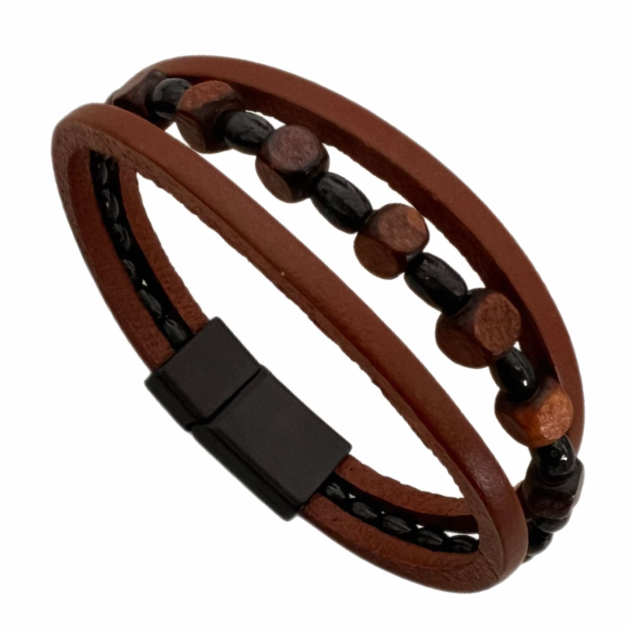 Καφέ δερμάτινο βραχιόλι με καφέ και μαύρες ξύλινες χάντρες