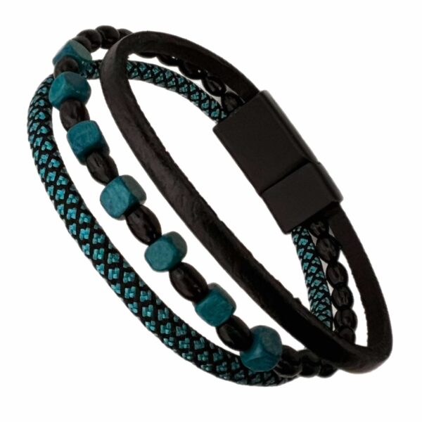 Μαύρο δερμάτινο βραχιόλι με μπλε και μαύρες χάντρες και μπλε κορδόνι
