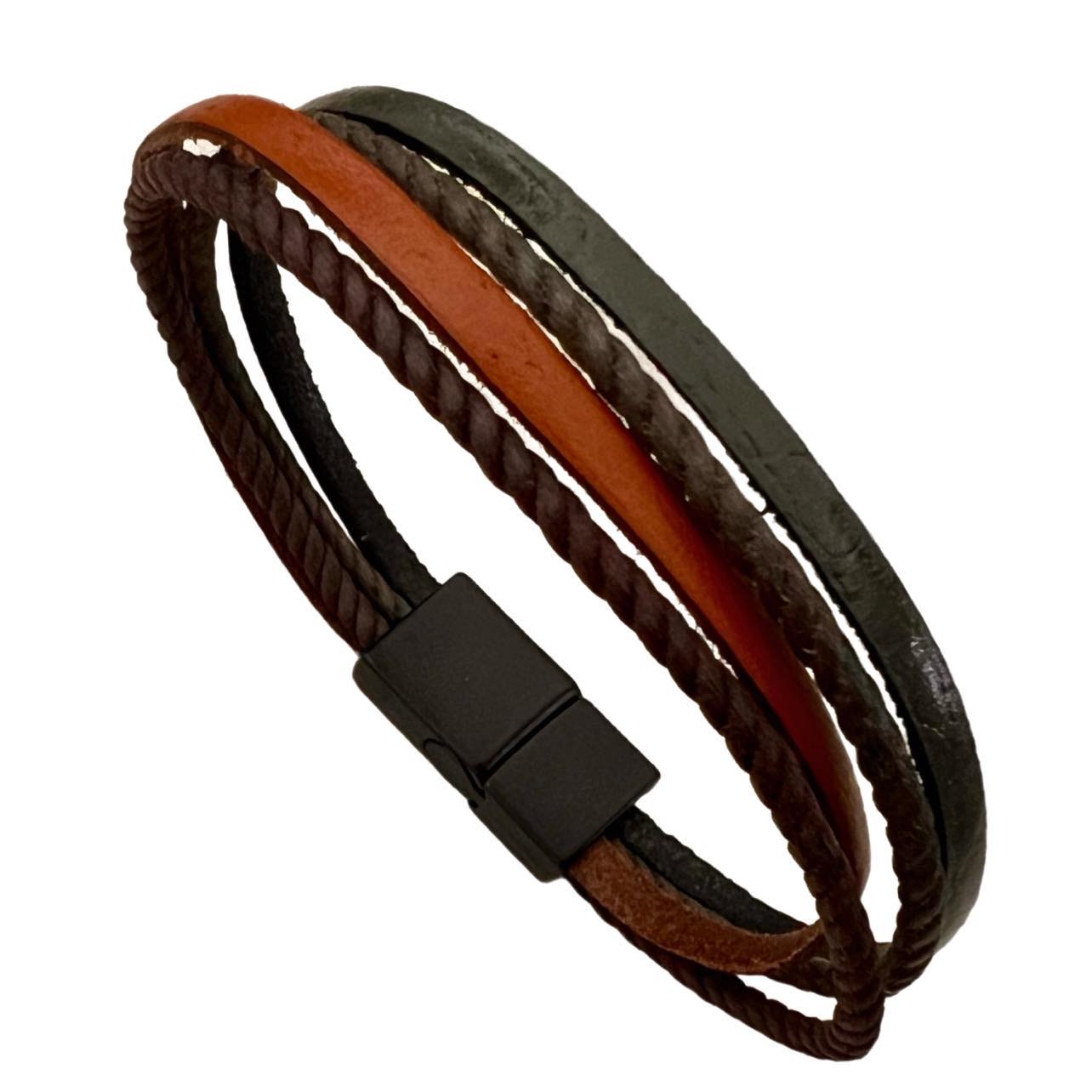 Μαύρο δερμάτινο βραχιόλι με γκρι και ταμπά κορδόνι