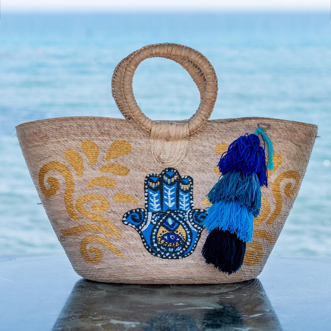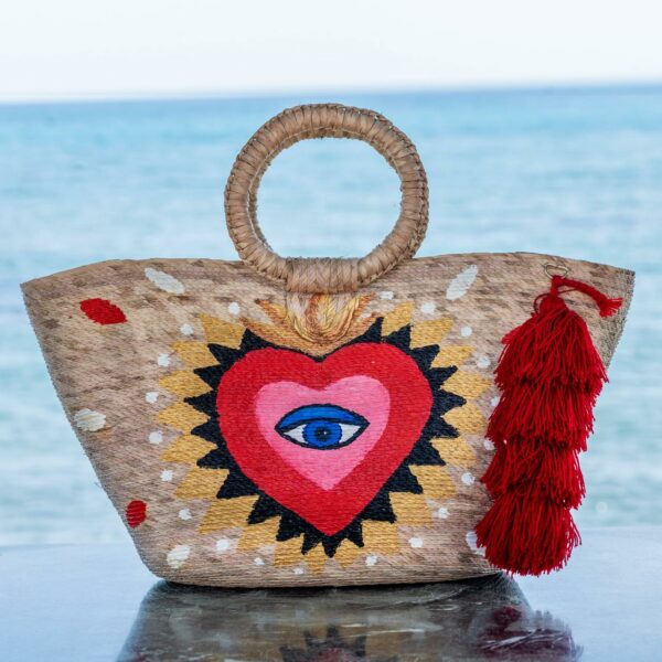Boho-style carrycot, made of totally handmade natural palm, with hand-painted design. Bohemian eye drawing good luck charm. Round handles. Tassels. Maxi size.